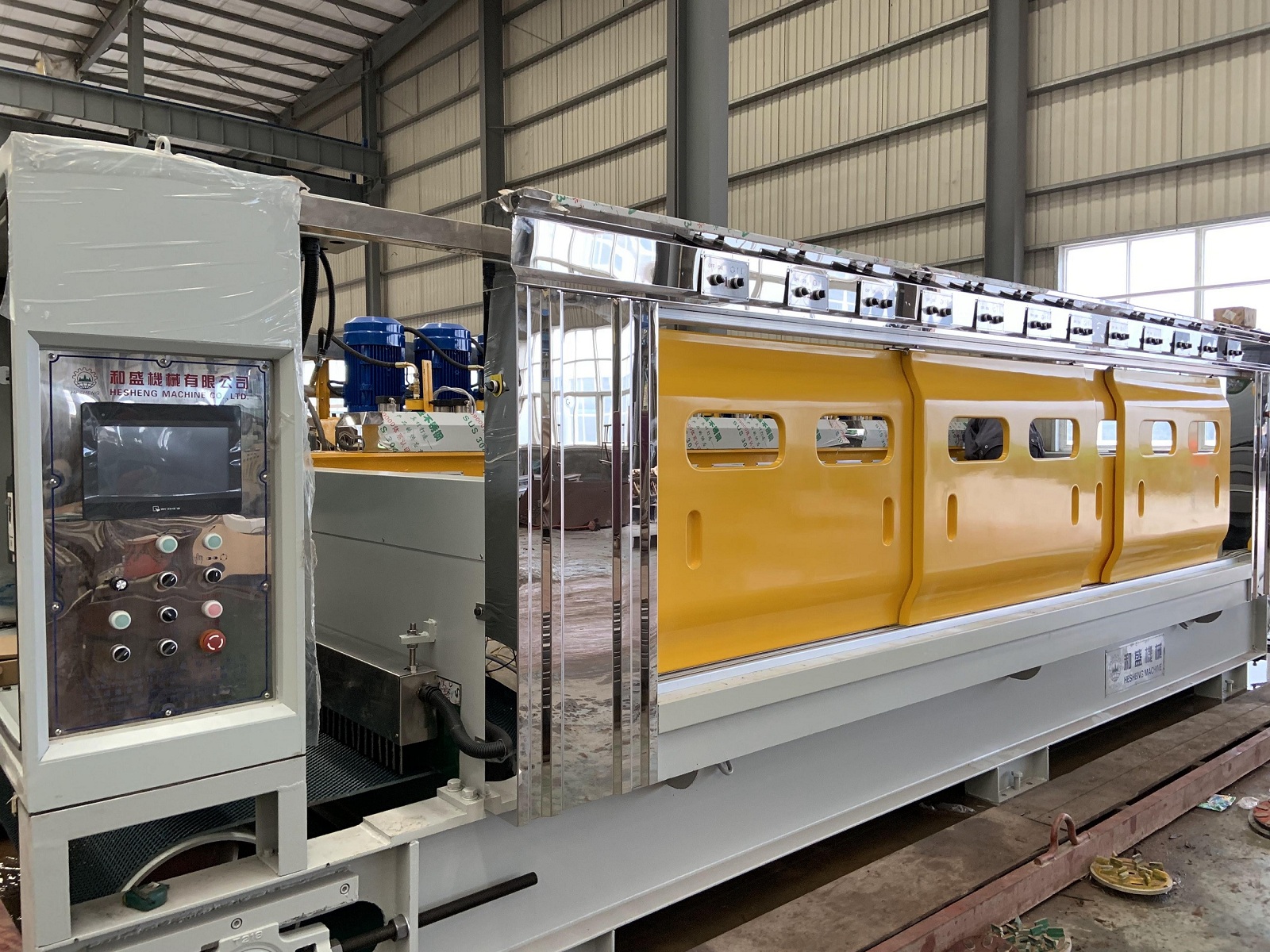 ? ??3.該機控制系統采用PLC終端控制,以液晶顯示觸摸屏終端為人機界面進行參數設定,設備運行過程中設有故障提示等等。該機適用于花崗石條板的連續磨削及拋光。板材輸送帶、磨盤橫移梁的工作速度均為變頻器調速;磨盤工作壓力、板材的磨削寬度在設定值范圍內可調。本機可對板材形狀自動識別,每個磨盤(磨頭)可根據識別板材的形狀自動升降,同時對板材磨削進行跟蹤記錄。整機均按標準化生產,性能穩定、故障率低等優點。