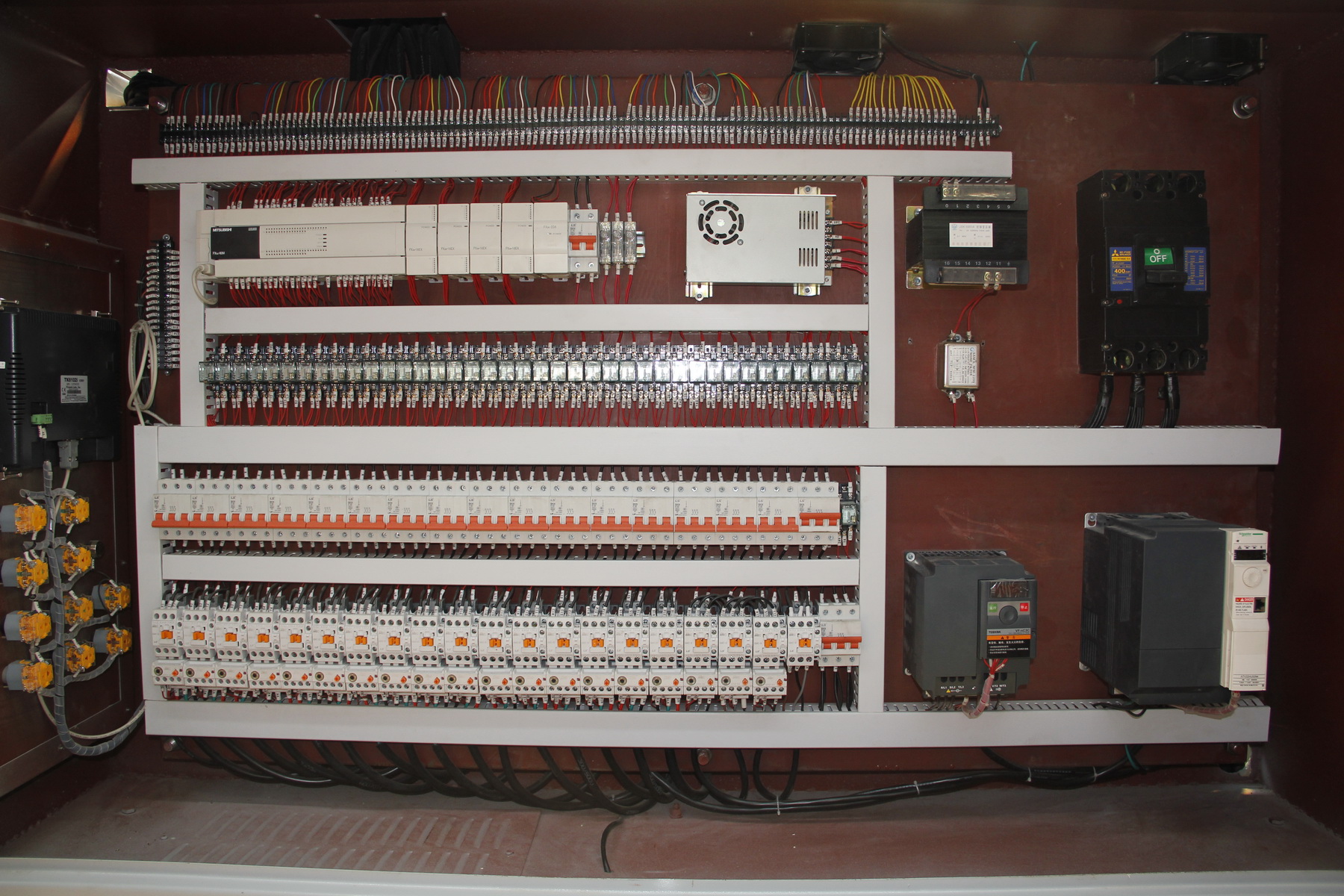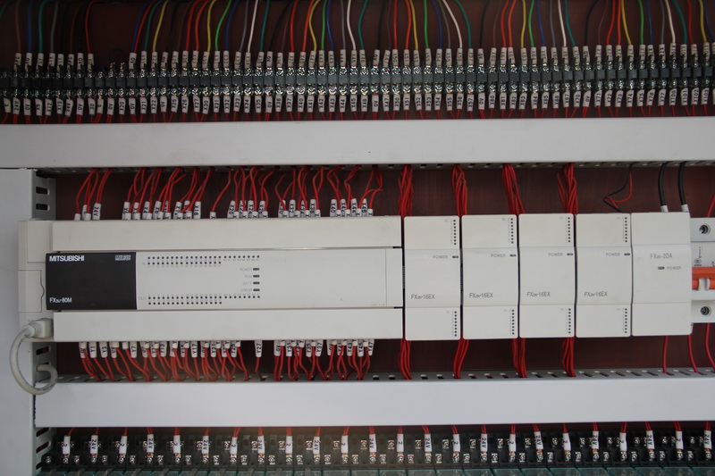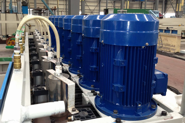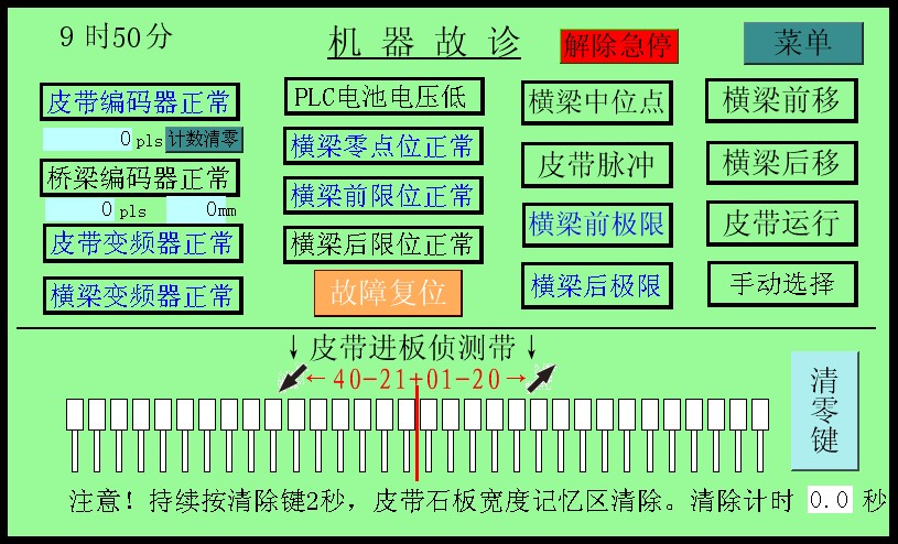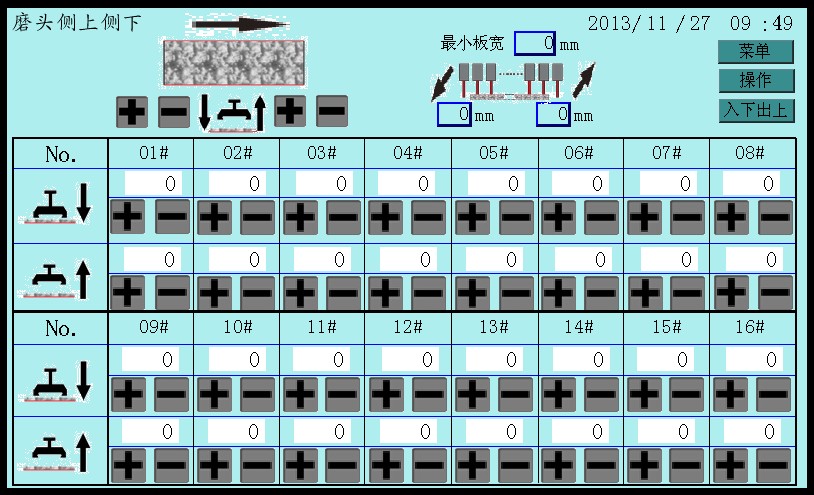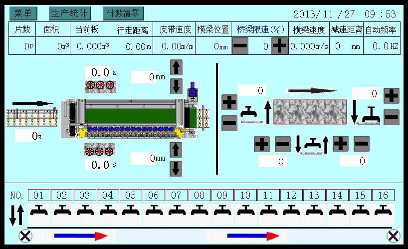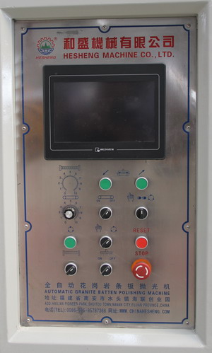 3.該機(jī)控制系統(tǒng)采用PLC終端控制,以液晶顯示觸摸屏終端為人機(jī)界面進(jìn)行參數(shù)設(shè)定,設(shè)備運行過程中設(shè)有故障提示等等。該機(jī)適用于花崗石條板的連續(xù)磨削及拋光。板材輸送帶、磨盤橫移梁的工作速度均為變頻器調(diào)速;磨盤工作壓力、板材的磨削寬度在設(shè)定值范圍內(nèi)可調(diào)。本機(jī)可對板材形狀自動識別,每個磨盤(磨頭)可根據(jù)識別板材的形狀自動升降,同時對板材磨削進(jìn)行跟蹤記錄。整機(jī)均按標(biāo)準(zhǔn)化生產(chǎn),性能穩(wěn)定、故障率低等優(yōu)點。