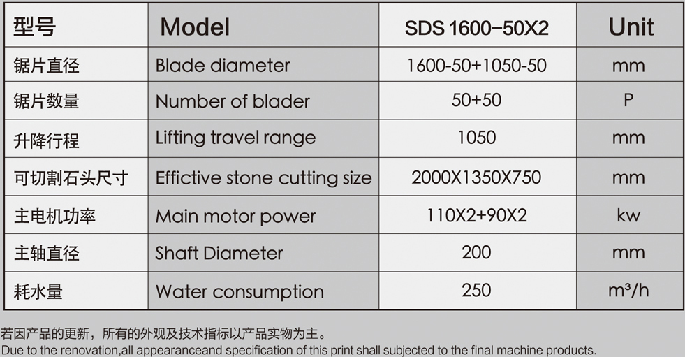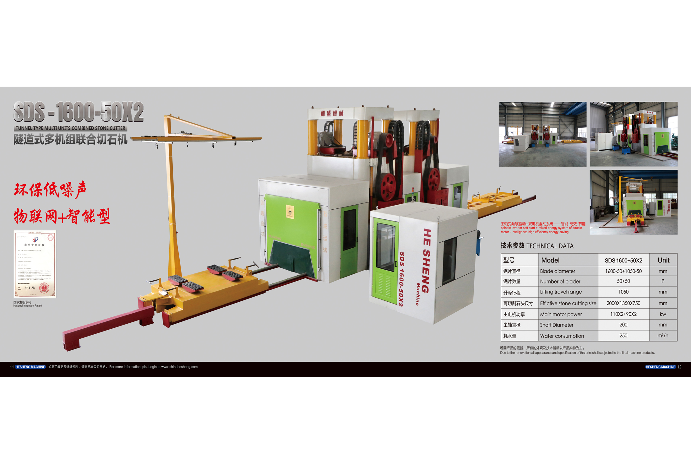 SDS-1600-50X2 隧道式多機(jī)組聯(lián)合切石機(jī)是一種免建廠房可直接安裝于礦山上的石材加工設(shè)備??s短建設(shè)周期,提高投資效率;可大大降低石材廠投資成本。該設(shè)備為流水線生產(chǎn)方式,鋸片采用同直徑為一組,鋸片直徑從小到大的階梯分布方式。每組鋸片只負(fù)責(zé)切割一小段,這樣切割可有效減少斧頭板、彎板、斜板等的產(chǎn)生。 整機(jī)采用封閉式箱體結(jié)構(gòu),大大減少了石材加工過程產(chǎn)生的噪音及粉塵污染。并在箱體內(nèi)部分布多個(gè)監(jiān)控?cái)z像頭,監(jiān)控切割狀況;并且可實(shí)時(shí)聯(lián)網(wǎng)進(jìn)行監(jiān)控操作。